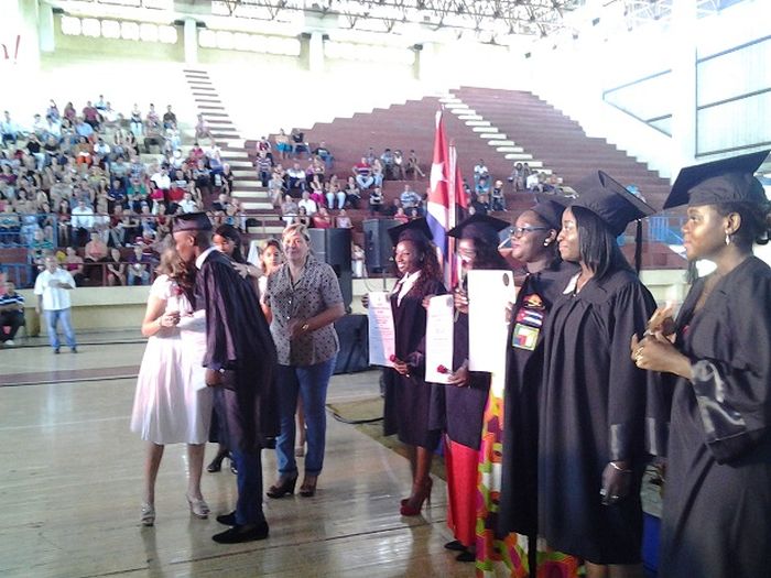 Momento de gran emoción se vivió en la Sala Polideportiva Yayabo, donde transcurrió la ceremonia, cuando la joven angolana Janisy Marilia Manuel Braga Dos Santos leyó, entre lágrimas, sentidas palabras de agradecimiento en nombre propio y de otros cinco coterráneos suyos tras vencer la especialidad de Pedagogía Psicología. La mejor graduada extranjera reconoció no solo el aporte meramente educacional del colectivo de la institución, sino también los valores inculcados en estos cinco años y la formación general que recibieron de parte del claustro y del resto de los trabajadores, incluidos los de servicio. “Espero que esto no sea un adiós, sino un hasta luego”, concluyó Janisy en perfecto español.