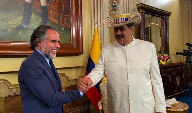 Con un fuerte apretón de manos, en reivindicación de la unidad soñada por los próceres, e intercambios de regalos, Maduro y Benedetti propiciaron el reencuentro entre Caracas y Bogotá.
