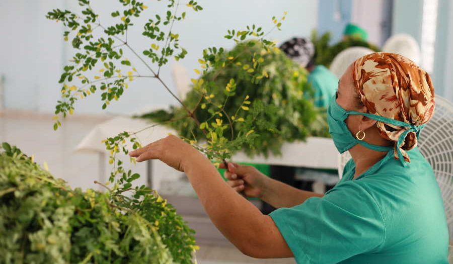 Manos femeninas en casi su totalidad se encargan del procesamiento industrial de las hojas de la moringa que un pequeño colectivo de obreros cosecha en las primeras plantaciones, que crecen casi en el jardín de la planta, aunque se espera para los venideros meses completar las 30 hectáreas de la Moringa oleifera Lam, suficientes para abastecer a la industria.