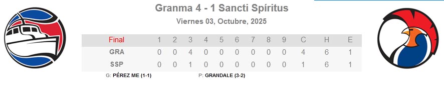 Los Gallos descontaron una en el cierre de ese propio episodio al combinar sencillos de Delvis Hernández y de Frederich Cepeda, y un error de la defensa granmense, que abrió las puertas del home a los espirituanos, para marcar la única del partido.