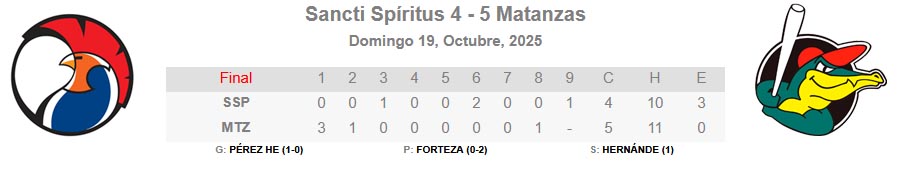 En el desafío de esta jornada, los yumurinos se impusieron cinco carreras por cuatro, gracias a un ataque tempranero ante las ofertas del joven Leandro Forteza, a quien le fabricaron cuatro anotaciones en apenas una entrada y dos tercios de actuación, y a una labor efectiva de Yamichel Pérez.