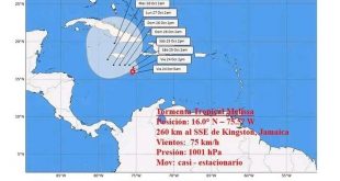 Durante las últimas horas la tormenta tropical Melissa ha mostrado poco cambio sobre aguas del mar Caribe, manteniéndose casi estacionaria. A las seis de la mañana su región central se estimó en los 16.0 grados de latitud Norte y los 75.5 grados de longitud Oeste, posición que la sitúa a unos 260 kilómetros al sur-sudeste de Kingston, Jamaica. Melissa mantiene sus vientos máximos sostenidos de 75 kilómetros por hora, con rachas superiores y su presión central es de 1001 hectoPascal.