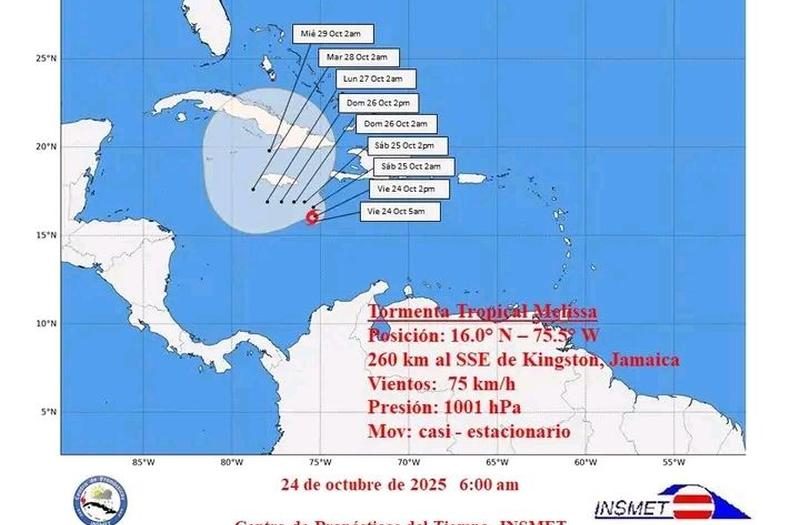La tormenta tropical Melissa permaneció casi estacionaria en el mar Caribe durante la madrugada de este viernes, con vientos máximos sostenidos de 75 kilómetros por hora y rachas superiores, informó el Centro de Pronósticos del Instituto de Meteorología (Insmet), en su Aviso de Ciclón Tropical No.7.