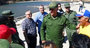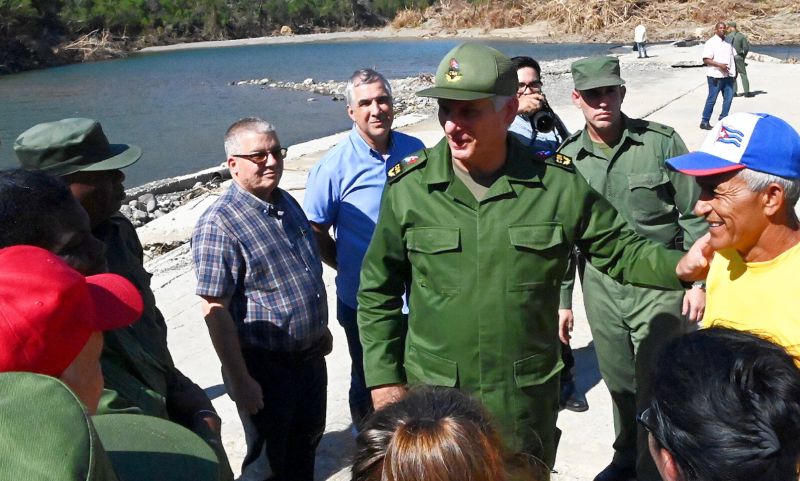El mandatario estuvo en el puente del río Baconao, colapsado por una crecida nunca antes vista y que tiene incomunicadas a unas quinientas personas de María del Pilar y 13 de Agosto, a las que se les lleva alimentos, agua y recursos para la recuperación por vías alternativas.