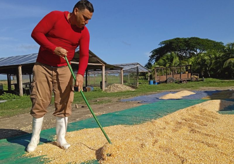Poner en explotación 50 hectáreas no fue obra de unos días, ni una labranza cómoda; asevera que se fajaron a machete con los cayos de maleza y cuanta área quedaba limpia se sembraba con rapidez, después sobrevino la rotación de cultivos. Cuando cosechen las 20 hectáreas de maíz transgénico contratadas para alimento porcino acometerán la segunda siembra de frijoles.