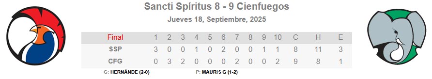 En un partido de constantes altibajos, en el que no faltaron reclamaciones, parada por lluvia y definición en extrainning, los Elefantes de Cienfuegos dejaron al campo a los Gallos espirituanos este jueves con marcador de nueve carreras por ocho y aseguraron el duelo particular luego de tres éxitos al hilo.