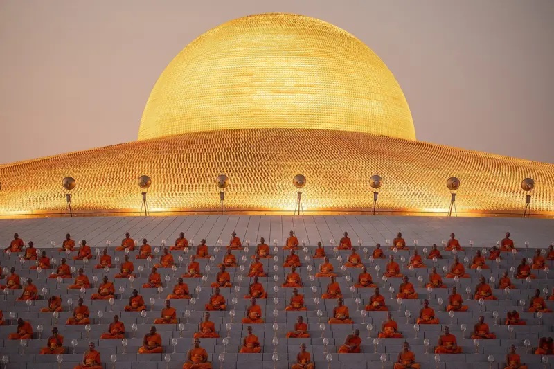 La foto de los monjes orando bajo la inmensa cúpula dorada de Wat Phra Dhammakaya, durante la ceremonia anual de Makha Bucha en febrero pasado, es impresionante por su brillo etéreo. Son decenas de monjes y devotos, muchos de ellos con faroles a sus costados, reunidos para conmemorar la primera gran enseñanza de Buda.