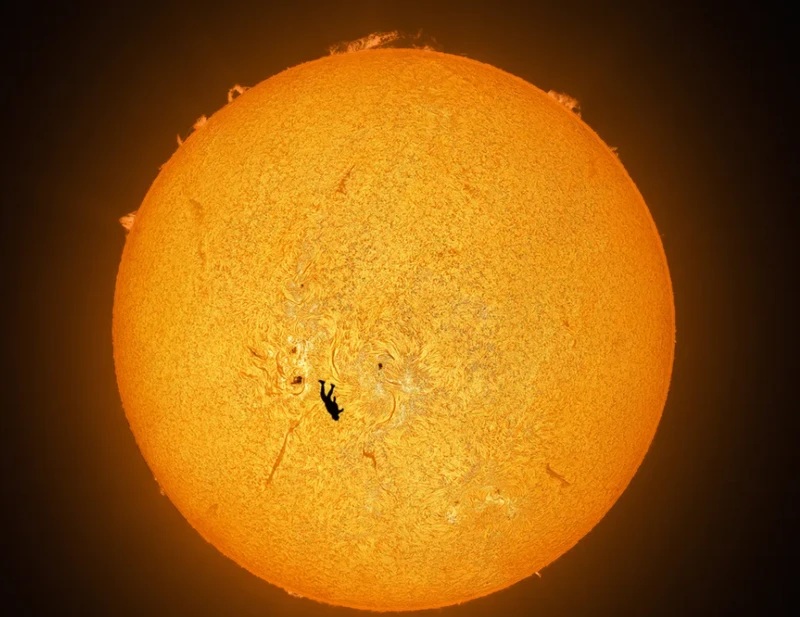 Una imagen extraordinaria capturada por el astrofotógrafo Andrew McCarthy, en la que se ve a su amigo practicando paracaidismo —silueteado contra una fotografía de gran detalle del Sol matutino en Arizona el 8 de noviembre—, cautivó la imaginación del mundo.