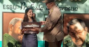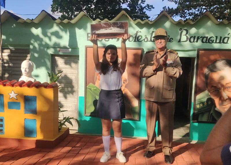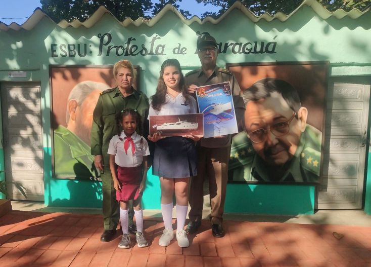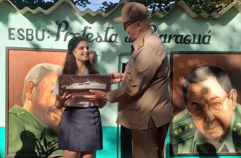 Aitana Torres Enrique, estudiante de la secundaria básica Protesta de Baraguá, de Sancti Spíritus, recibió hoy la réplica del yate Granma y el diploma que la acredita como ganadora del primer lugar nacional en la modalidad de Carta-Saludo del Concurso Amigos de las FAR.