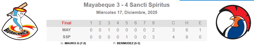 Bajo los principios de la Regla Schiller, los mayabequenses consiguieron fabricar par de anotaciones en el octavo, pero los espirituanos respondieron con tres ante las ofertas de José Ignacio Bermúdez, quien pese a cargar con la derrota, registró una positiva faena al tirar el choque completo.
