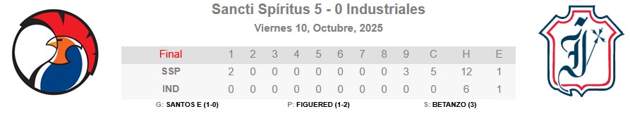 Santos, que se hizo de su primer triunfo en la contienda luego de completar cinco entradas y permitir cuatro imparables, tuvo el respaldo de José Luis Brañas (efectivo en dos capítulos al ritmo de un sencillo, dos ponches y sin boleto) y Fernando Betanzo (permitió un incogible y ponchó a cuatro), quien logró su tercer juego salvado.