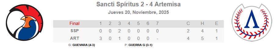 Los espirituanos descontaron dos en el tercero, cuando ligaron indiscutible de Rodolexis Moreno y triple de Lázaro Fernández, quien también accedió al home momentos antes de que Andy Cosme la sacará del parque en la parte de esa propia entrada para completar el marcador.