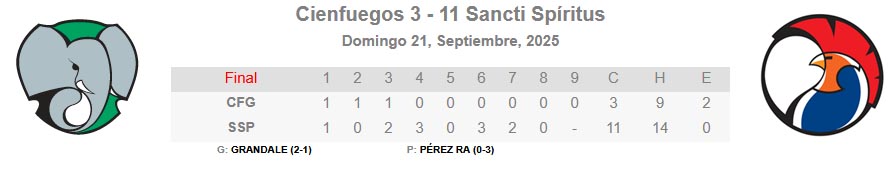 Con este triunfo, Sancti Spíritus no pudo evitar la derrota en el duelo particular con Cienfuegos (2-3), pero consiguió mantener un balance positivo (nueve victorias frente a seis reveses) en la campaña que este domingo cerró sus terceros pareos y en la que los Gallos conservan posición en la primera mitad de la tabla de posiciones.