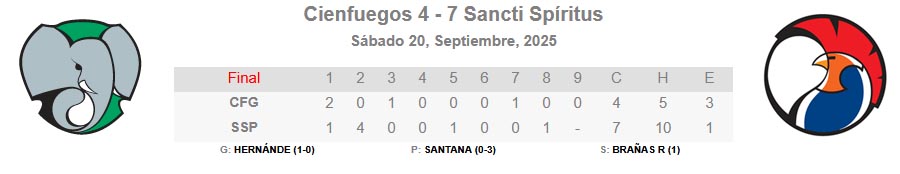 En lo adelante, el desafío transitó por cauces más tranquilos, con una más para los cienfuegueros en el tercero sin conectar de hit, la sexta para los espirituanos en el quinto, antes de que los Elefantes descontarán una en el séptimo (jonrón de Félix Rodríguez) y los de Eriel completaran el marcador en el octavo por cuadrangular de Liuber Gallo.