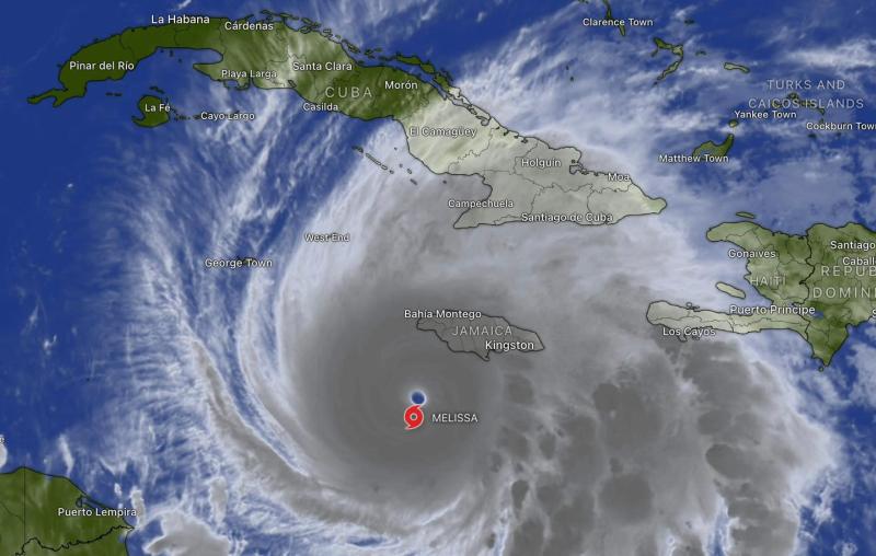 El huracán Melissa durante las últimas horas se ha mantenido con poco cambio en su intensidad. Sus vientos máximos sostenidos continúan siendo de 280 kilómetros por hora, con rachas superiores y su presión central descendió hasta 901 hectoPascal, por lo que se mantiene como un huracán de gran intensidad, categoría cinco en la escala Saffir-Simpson.