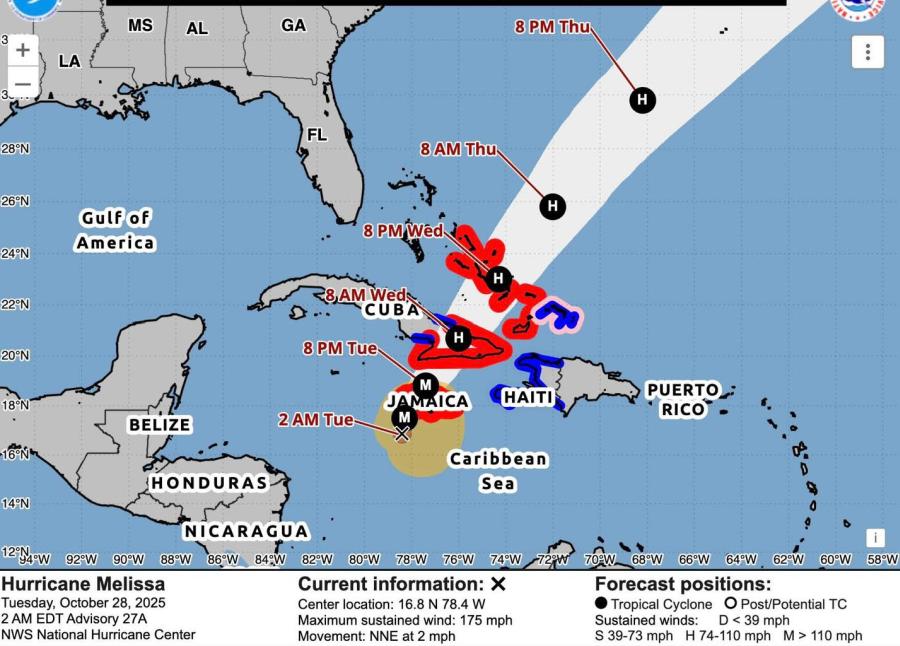 En las próximas 24 horas se espera que el huracán incline su trayectoria gradualmente hacia el nordeste, aumentando su velocidad de traslación. Según la trayectoria pronosticada, se espera que el ojo de Melissa se adentre en Jamaica durante la mañana de hoy, aproximándose a la costa sur de la región oriental de Cuba durante la noche de hoy y en la madrugada del miércoles. Durante su trayectoria el huracán Melissa experimentará fluctuaciones en su intensidad, no obstante, se mantendrá como un huracán de gran intensidad a su paso por Jamaica y Cuba.