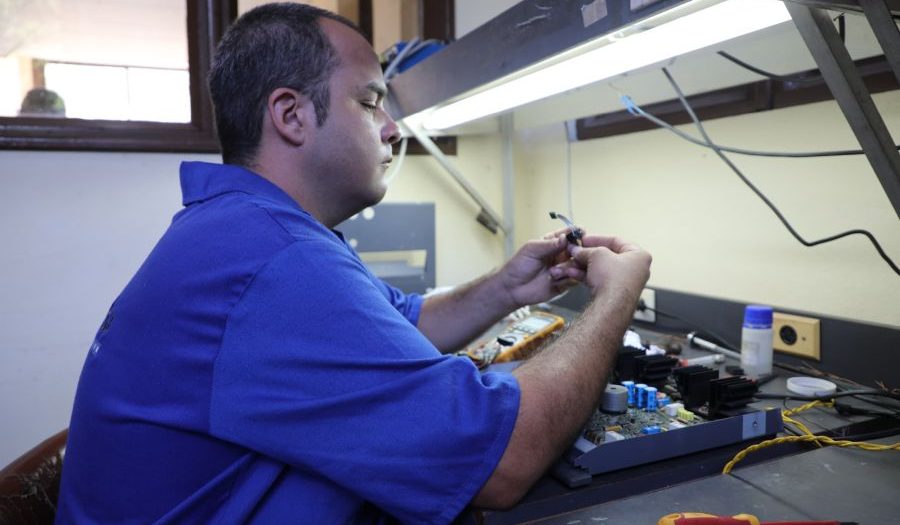Su taller lleno de cables, voltímetros, destornilladores, es el sitio perfecto; allí cobran vida esos equipamientos que por su obsolescencia o uso continuado han dejado de funcionar.