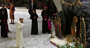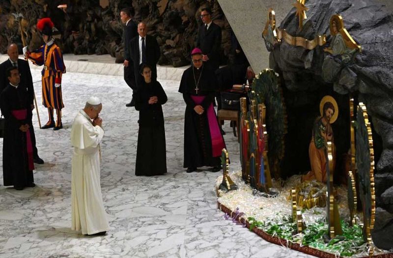 En estos días festivos la Plaza de San Pedro luce sus mejores galas, adornada con un gigantesco árbol navideño y un monumental pesebre procedente de la sureña región italiana de Campania, creado por la diócesis de Nocera Inferiore-Sarno, con figuras a tamaño natural que reflejan la arquitectura y la tradición napolitana del siglo XVIII.