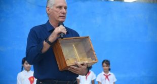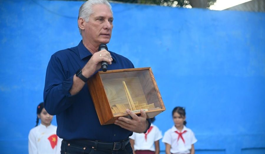 Luego de explicar la razón por la cual estaba en el centro cuya matrícula es de 604 alumnos que cursan desde preescolar hasta el sexto grado, Díaz-Canel Bermúdez ofreció una detallada explicación sobre los objetos con los cuales había llegado: “Este primero -enunció- es la maqueta del Museo de Historia Militar de Vietnam, que lo visitamos el primer día. Llegando casi a Vietnam lo visitamos”.
