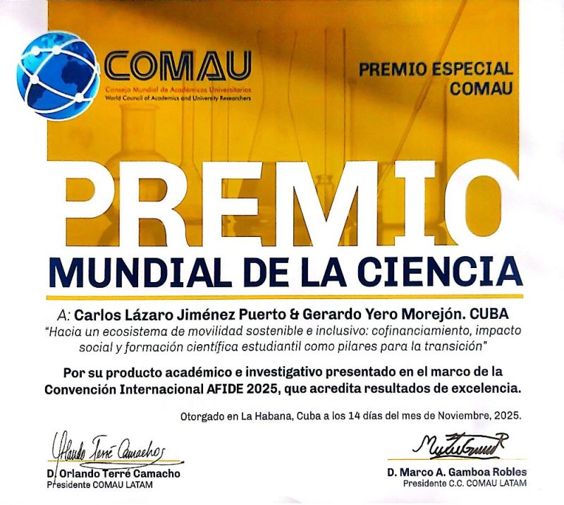 El pasado 12 de noviembre el Consejo Mundial de Académicos e Investigadores Universitarios (COMAU) entregó en ceremonia oficial los premios mundiales de la Ciencia de productos investigativos y científicos a resultados relevantes en varias áreas del conocimiento durante la XI Convención Internacional de Actividad Física y Deportes 2025.