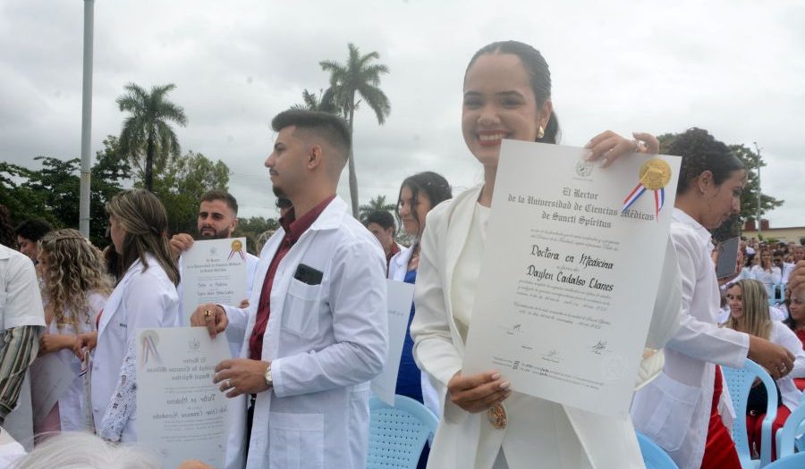 La Plaza de la Revolución Mayor General Serafín Sánchez Valdivia, de Sancti Spíritus, se vistió de blanco en la mañana de este miércoles durante el acto de graduación de la Universidad de Ciencias Médicas correspondiente al curso escolar 2024-2025. Allí recibieron el título que los acredita como profesionales de la Salud más de 600 jóvenes que hoy reafirmaron el compromiso de salvar vidas y servir a Cuba.