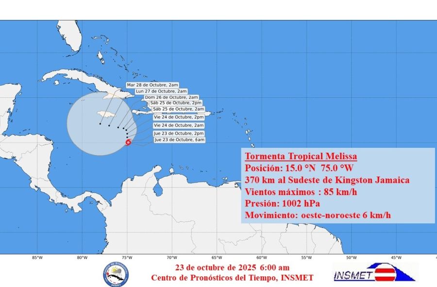 En las próximas veinticuatro horas este sistema mantendrá similar velocidad de traslación, inclinando gradualmente su trayectoria al noroeste y luego al norte. La tormenta tropical Melissa se mantendrá con poco movimiento durante los próximos días sobre el mar Caribe central, al sur de las Antillas Mayores. Las condiciones oceánicas y atmosféricas serán favorables para su gradual intensificación.
