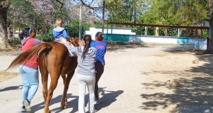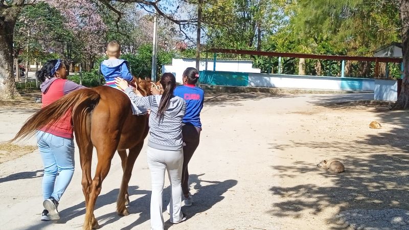 En un pequeño ranchón situado dentro de la Feria Delio Luna Echemendía, de Sancti Spíritus, funciona desde el 2005 el Centro Provincial de Equinoterapia, como parte de un programa destinado a rehabilitar a niños con afectaciones en su desarrollo físico, psicológico, cognitivo o social. Allí acuden diariamente o en días alternos 26 pacientes que con anterioridad fueron evaluados y remitidos para que reciban tratamientos por parte de varios técnicos subordinados al Inder, Educación y Salud, y que se complementa con los ejercicios sobre el lomo del caballo, que es atendido, al igual que la instalación, por la Unidad Empresarial de Base Flora y Fauna de Arroyo Blanco.