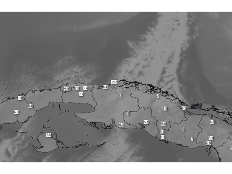 Si no hay “intervención” de la nubosidad ni cambios en el viento la horaria típica de ocurrencia del valor mínimo se sitúa cerca de las 7 de la mañana en el horario normal e incluso unos minutos después, previo a la salida del Sol. Como referencia ese día salió a las 7:05 am en la “Atenas de Cuba”. ¿Qué podría haber pasado si no se hubiera nublado? Ya no lo sabremos. Aquí puede ver un “zoom” del occidente de Cuba precisamente cerca de las 4 de la madrugada, donde puede ver que el “cero” que marca la posición de la estación de Indio Hatuey queda todavía desprovisto de nubes, mientras otras zonas ya están cubiertas.