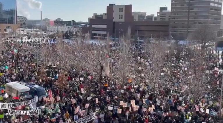 Una multitud masiva de manifestantes fue vista marchando en el centro de Minneapolis, mientras coreaban consignas y levantaban carteles que decían “Fuera ICE”, al tiempo que pedían el fin de la represión federal contra la inmigración en el estado y otras ciudades demócratas en todo el país.