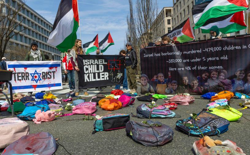 Activistas recrearon en Washington, cerca de la Casa Blanca, la escena del crimen posterior al doble ataque estadounidense con misiles contra la escuela primaria de Minab, en la provincia iraní de Hormozgán.
