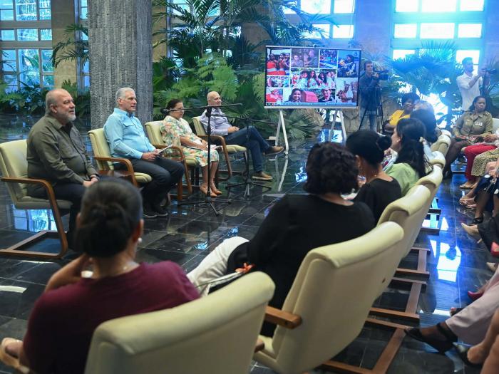 Así expresó el Primer Secretario del Comité Central del Partido y Presidente de la República, Miguel Díaz-Canel Bermúdez, a un nutrido grupo de féminas, entre líderes comunitarias, dirigentes de bases, trabajadoras del sector estatal y no estatal, profesionales de las ciencias, representantes de los diferentes sectores y dirigentes de la Federación de Mujeres Cubanas (FMC), en encuentro, en la tarde de este sábado, en el Palacio de la Revolución.