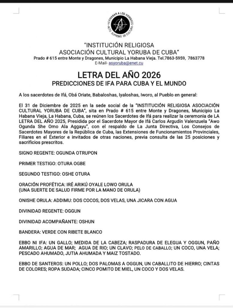 Un grupo de sacerdotes cubanos de la religión Yoruba dio a conocer en la madrugada de este primero de enero la Letra del Año, algunos consejos para enfrentar el nuevo período que comienza.