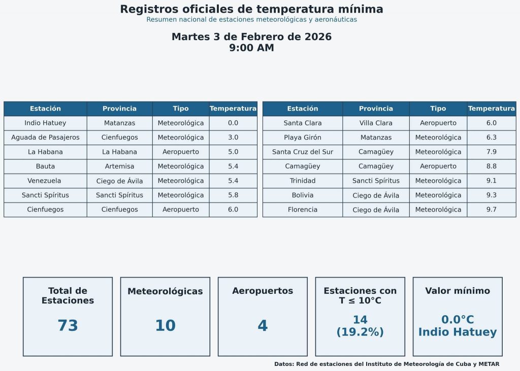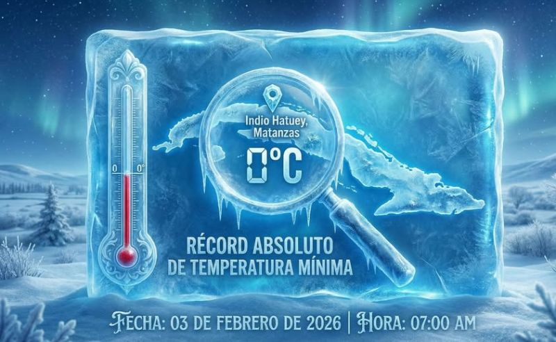 La estación meteorológica de Indio Hatuey, en la occidental provincia de Matanzas, reportó este 3 de febrero un nuevo récord de temperatura mínima en esta madrugada: 0 grados Celsius, cifra que desbanca la anterior de 0,6 en la localidad de Bainoa, en 1996.