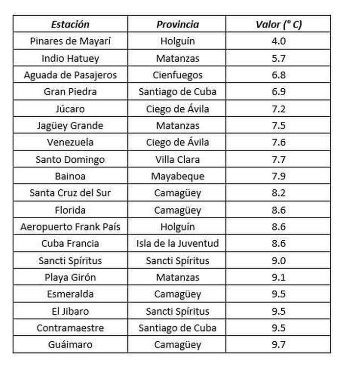 El evento más significativo ocurrió en la estación meteorológica de Pinares de Mayarí, en la provincia de Holguín, donde el termómetro descendió hasta los 4.0 grados Celsius. Este valor no solo constituye un nuevo récord de temperatura mínima absoluta para dicha estación, sino que también se erige como un nuevo récord mínimo para toda la provincia de Holguín en el mes de febrero, destacando la intensidad del episodio frío.