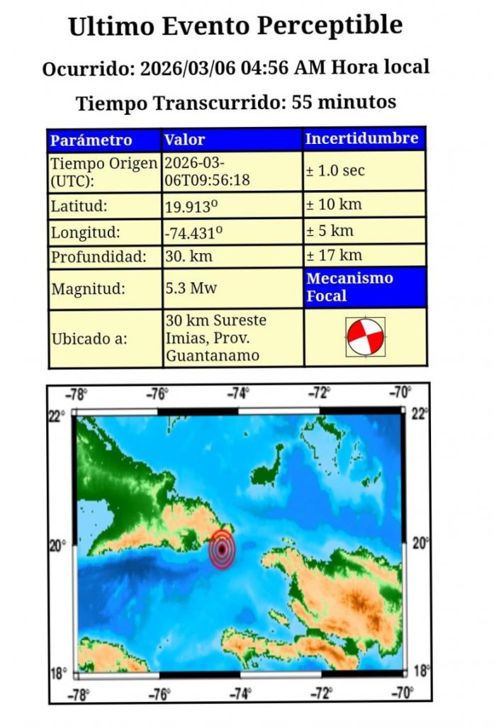 La red de estaciones del Servicio Sismológico Nacional Cubano ha registrado un terremoto reportado como perceptible a las 4:56 am hora local, localizado en las coordenadas 19.85 grados de latitud norte y los 75.42 grados de longitud oeste, a una profundidad de 30.0 km y con una magnitud de 5.3 situado a 30 km al sureste de Imías, Provincia de Guantánamo.