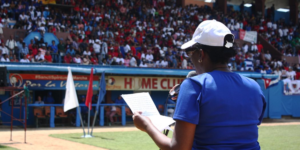 La plenaria sindical que cada año se celebra en la ciudad de Sancti Spíritus en vísperas del Primero de Mayo volvió a colmar el graderío del estadio José Antonio Huelga.