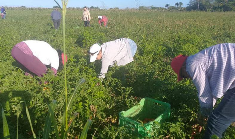 Ekaterina Gowen Dickinson, secretaria general de la CTC en Sancti Spíritus validó el aporte realizado este domingo a la atención de cultivos varios y la recogida de tomate en ese enclave agrícola que aporta alimentos para los trabajadores del gremio azucarero.